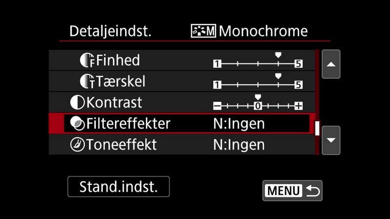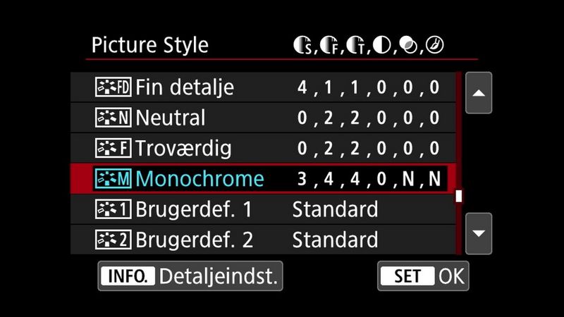 På samme måde som ved andre Picture Style-indstillinger kan du tilpasse Monokrom for at opnå en række forskellige udseender. Dette gøres ved at markere det på Picture Style-menuen og trykke på knappen INFO.