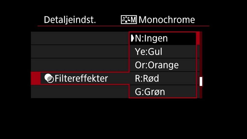 Der er et par indstillinger, som er unikke for Monokrom-indstillingen: filtereffekt og toneeffekt. Mange farver ser ens ud, når de er ændret til gråtoner, men filtereffekten giver dig mulighed for at fremhæve bestemte farver ved at gøre dem lysere eller mørkere. Kameraet har fire filtereffekter: gul, orange, rød og grøn. Hvert filter gør sin egen farve lysere og gør andre farver mørkere i varierende grad.